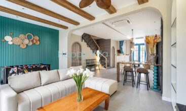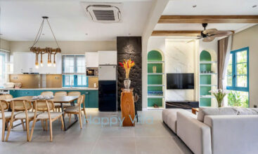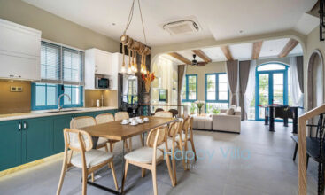 - Phòng khách: Máy lạnh, TV Smart, bàn ăn dài cao cấp.